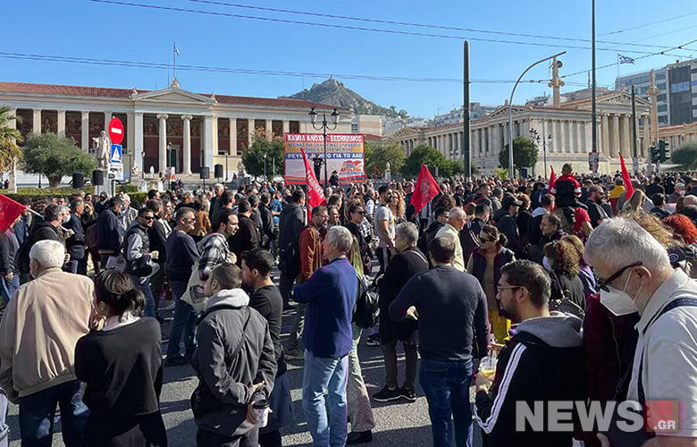Συγκέντρωση στα Προπύλαια του Πανεπιστημίου στο κέντρο της Αθήνας, πραγματοποιεί αυτήν την ώρα το ΠΑΜΕ, στο πλαίσιο της 24ωρης απεργίας.