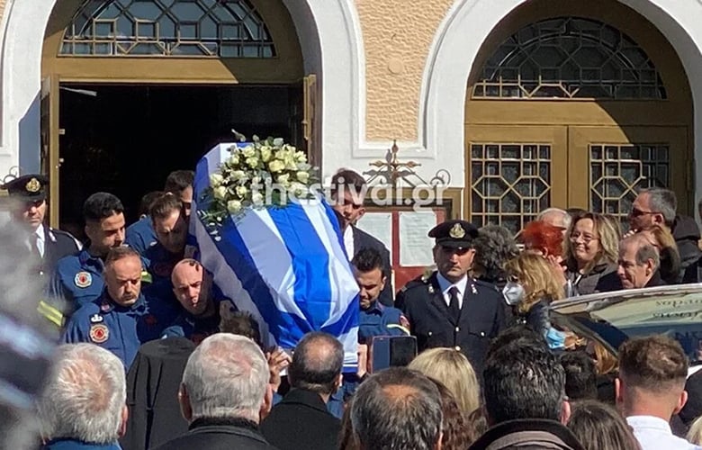 Το φέρετρο του 23χρονου ήταν καλυμμένο με την ελληνική σημαία, ενώ η μπάντα του Πυροσβεστικού Σώματος παιάνιζε πένθιμα εμβατήρια.