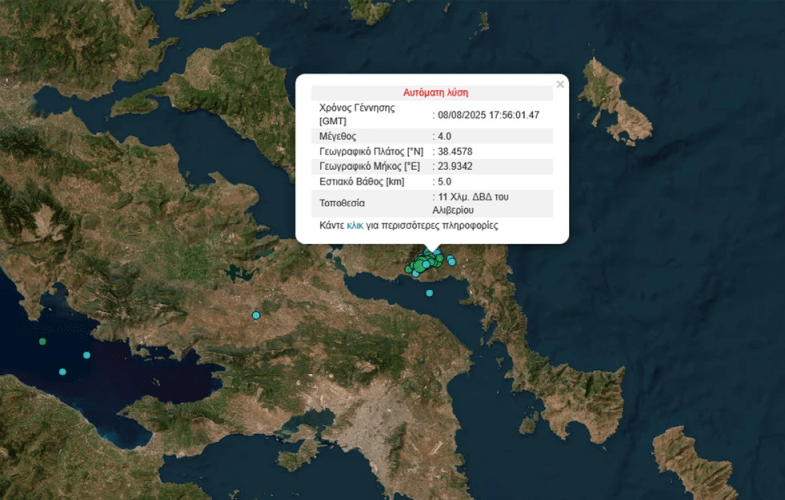 Ισχυρός σεισμός μεγέθους 4 Ρίχτερ σημειώθηκε λίγο πριν τις 9 το βράδυ στην Εύβοια, προκαλώντας ανησυχία στους κατοίκους. Σύμφωνα με το Γεωδυναμικό Ινστιτούτο, το επίκεντρο εντοπίζεται περίπου 10 χιλιόμετρα βορειοδυτικά του Αλιβερίου, ενώ η δόνηση έγινε αισθητή και σε πολλές περιοχές της Αττικής.