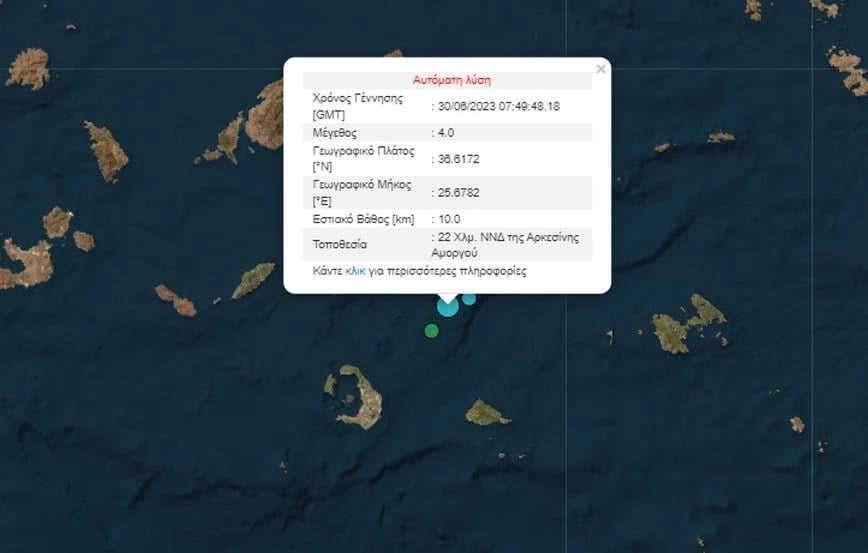 Σεισμός σημειώθηκε πριν από λίγα λεπτά ανάμεσα σε Σαντορίνη και Αμοργό. Συγκεκριμένα έγινε 22 Χλμ. νότιο-νοτιοδυτικά της Αρκεσίνης Αμοργού.