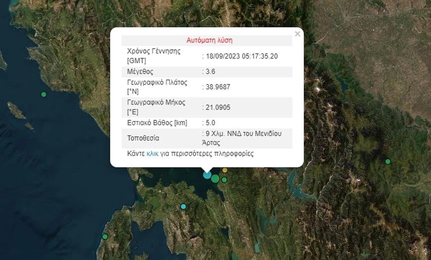 Το επίκεντρο εντοπίστηκε στον Αμβρακικό κόλπο, εννέα χιλιόμετρα νότια, νοτιοδυτικά του Μενιδίου