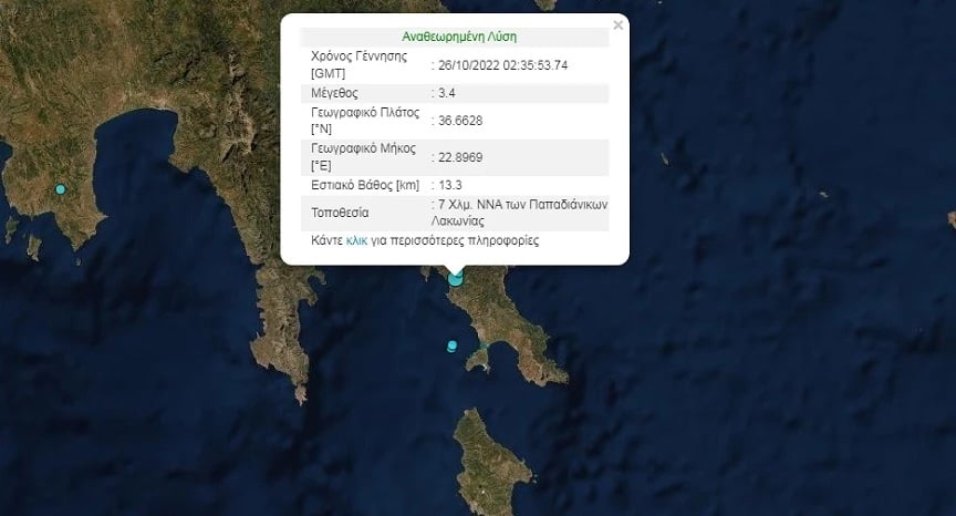 Πιο συγκεκριμένα, σύμφωνα με το Γεωδυναμικό Ινστιτούτο Αθηνών, η σεισμική δόνηση σημειώθηκε στις 05:35, επτά χιλιόμετρα νοτιοανατολικά των Παπαδιάνικων Λακωνίας και είχε εστιακό βάθος 16,3 χιλιόμετρα.