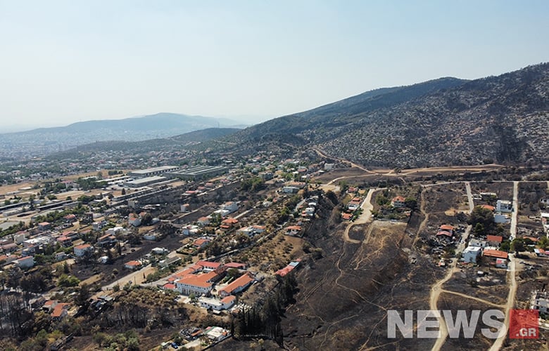 Καμένα δέντρα και σπίτια ανάμεσα στο λιγοστό πια πράσινο