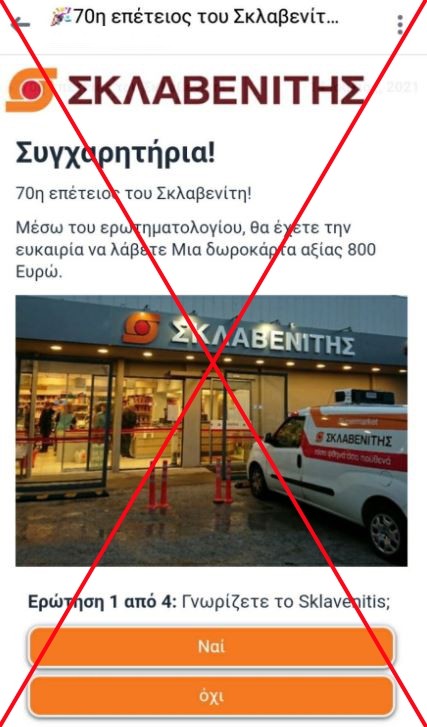 «Βρίσκεται σε εξέλιξη παράνομη χρήση από αγνώστους της επωνυμίας της Εταιρείας μας, του σήματός μας και φωτογραφιών Καταστημάτων μας σε δήθεν διαγωνισμούς σε μέσα κοινωνικής δικτύωσης και εφαρμογές επικοινωνίας, όπου ζητείται από συνδρομητές να συμμετάσχουν απαντώντας σε ερωτήσεις και καταχωρώντας προσωπικά τους στοιχεία, με όφελος δήθεν δωροκάρτες για αγορές από τα Καταστήματά μας.