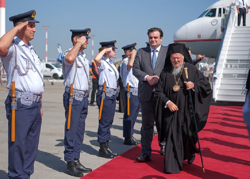 Σύμφωνα με το σχετικό ανακοινωθέν, τον Παναγιώτατο και τη συνοδεία του υποδέχθηκαν στον Διεθνή Αερολιμένα Αθηνών «Ελευθέριος Βενιζέλος» -με τη συνοδεία αγήματος της Αερονομίας της Πολεμικής Αεροπορίας- τα μέλη της Οργανωτικής Επιτροπής του Συνεδρίου, μητροπολίτες Μαρωνείας και Κομοτηνής Παντελεήμων και Λαρίσης και Τυρνάβου Ιερώνυμος, ο γενικός διευθυντής της Επικοινωνιακής και Μορφωτικής Υπηρεσίας της Εκκλησίας της Ελλάδος (ΕΜΥΕΕ) και γραμματέας της Οργανωτικής Επιτροπής, Αλέξανδρος Κατσιάρας, ο μητροπολίτης Λαοδικείας Θεοδώρητος, διευθυντής εκπροσωπήσεως του Γραφείου του Οικουμενικού Πατριαρχείου στην Αθήνα, και εκ μέρους της κυβέρνησης ο υπουργός Παιδείας, Θρησκευμάτων και Αθλητισμού, Κυριάκος Πιερρακάκης.