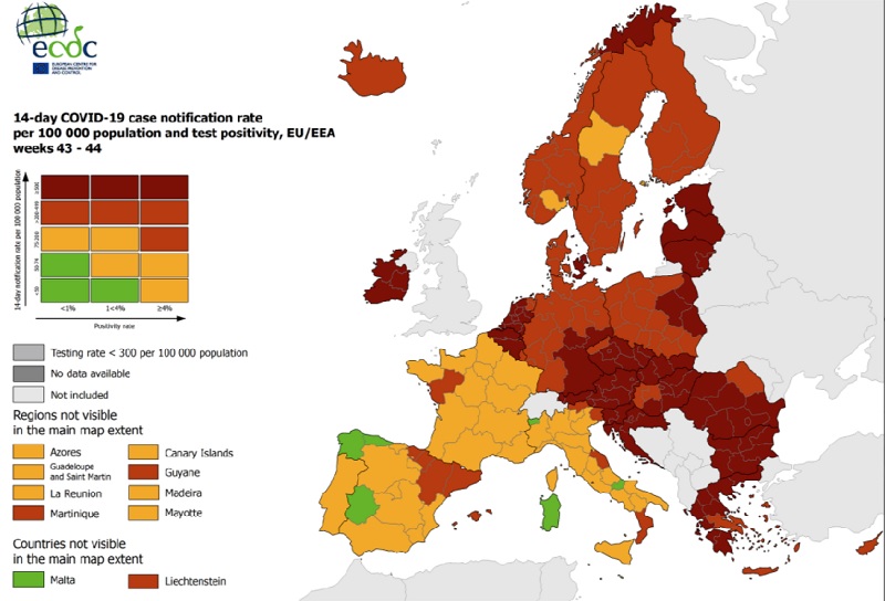 Ραγδαία είναι η επιδείνωση της επιδημιολογικής εικόνας στην Ελλάδα, όπως προκύπτει από τα επικαιροποιημένα στοιχεία, που παρουσίασε σήμερα 11 Νοεμβρίου το Ευρωπαϊκό Κέντρο Πρόληψης και Ελέγχου Νόσων (ECDC).