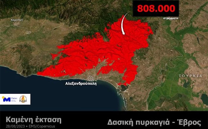 Όπως προκύπτει από την ανάλυση των δορυφορικών δεδομένων, η συνολική έκταση που κατέκαψε η δασική πυρκαγιά του Έβρου, η οποία προέκυψε από τη συνένωση των πυρκαγιών σε Αλεξανδρούπολη και Δαδιά, ξεπερνά τα 808.000 στρέμματα (έως την 28.08.2023, 12:28 τοπική ώρα).