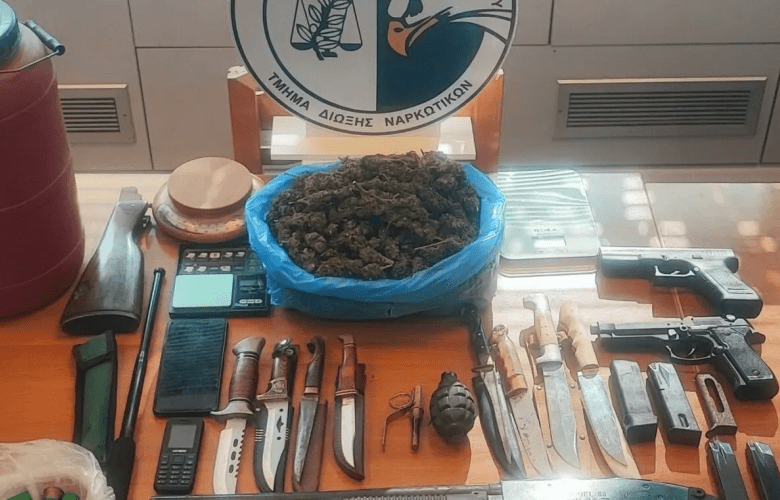 Κατά τη διάρκεια της επιχείρησης εντοπίστηκε ο ημεδαπός, ο οποίος αφού ακινητοποιήθηκε συνελήφθη και ακολούθησαν νομότυπες έρευνες σε οικίες και χώρους που κατέχει και χρησιμοποιεί και σε ποιμνιοστάσιο ιδιοκτησίας του όπου βρέθηκαν και κατασχέθηκαν συνολικά 577 γραμμάρια κάνναβης, 2 πιστόλια, κυνηγετικό όπλο, χειροβομβίδα, πυροκροτητής, 5 γεμιστήρες, 3 ζυγαριές ακριβείας, πτυσσόμενη ράβδος, μαχαίρια και φυσίγγια διαφόρων τύπων και διαμετρημάτων και κινητά τηλέφωνα Επίσης κατασχέθηκε Ι.Χ.Ε. αυτοκίνητο ως μέσο διακίνησης ναρκωτικών ουσιών.