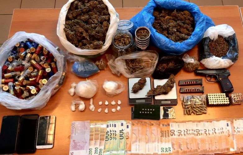 * 750,9 γραμμάρια κάνναβης, 86 γραμμάρια κοκαΐνης, το χρηματικό ποσό των 6.515 ευρώ ως προερχόμενο από παράνομες δραστηριότητες, πιστόλι με δύο γεμιστήρες, κυνηγετικό όπλο,