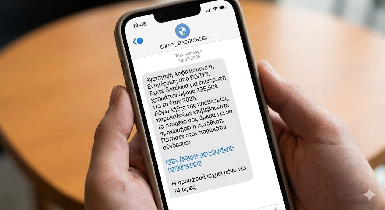 Επιπλέον, τα κακόβουλα SMS χρησιμοποιούν γενικές προσφωνήσεις αντί για το ονοματεπώνυμο του ασφαλισμένου και καλλιεργούν ένα τεχνητό αίσθημα επείγοντος. Ο ΕΟΠΥΥ ξεκαθαρίζει ότι ποτέ δεν ζητά επιβεβαίωση τραπεζικών στοιχείων μέσω εξωτερικών συνδέσμων σε μηνύματα κειμένου.