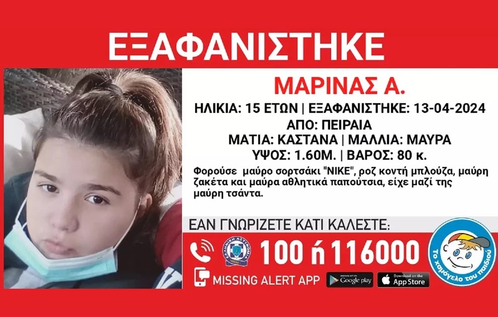 Συναγερμός έχει σημάνει στον Πειραιά, από το βράδυ του Σαββάτου (13/4) που εξαφανίσθηκε η 15χρονη Μαρίνα Α..