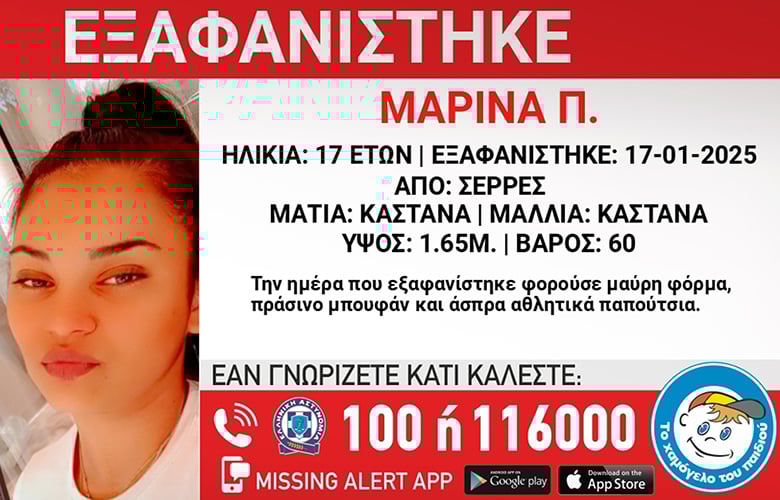 Σύμφωνα με το Χαμόγελο του Παιδιού η Μαρίνα εξαφανίστηκε στις 17/01/2025, μεσημεριανές ώρες από την περιοχή των Σερρών.