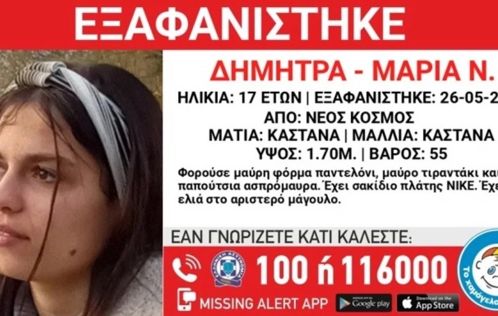 Σύμφωνα με το «Χαμόγελο του Παιδιού», στις 26/05/2025, μεσημεριανές ώρες, εξαφανίστηκε από την περιοχή του Νέου Κόσμου, η Δήμητρα – Μαρία Ν., 17 ετών.