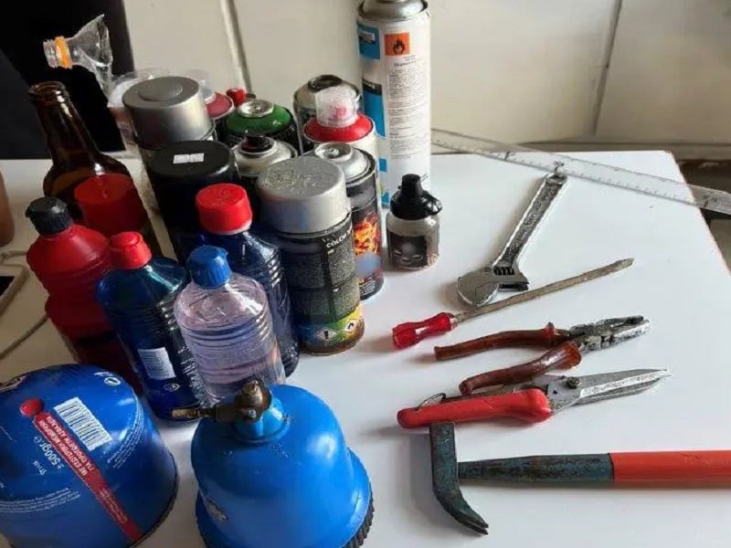 Ειδικότερα, οι αστυνομικοί κατά την διάρκεια περιπολίας τους στο κέντρο της Αθήνας, έκριναν ύποπτες τις κινήσεις του 33χρονου και προέβησαν σε έλεγχο. Μέσα στα δύο σακίδια πλάτης που έφερε ο 33χρονος μαζί του βρέθηκαν και κατασχέθηκαν δύο γκαζάκια και μπουκάλι βουτανίου, τρία μπουκάλια οινοπνεύματος, άδειο γυάλινο μπουκάλι μπύρας, πλαστικό μπουκάλι περιέχον κομμάτι αλουμινόχαρτου και βολίδες αεροβόλου όπλου, βολίδες αεροβόλου εντός πλαστικής συσκευασίας, 9 σπρέι μπογιάς, καθαριστικό και μπουκάλι γεμίσματος αναπτήρα, σφυρί, πένσα, γαλλικό κλειδί, ψαλίδι και κατσαβίδι.