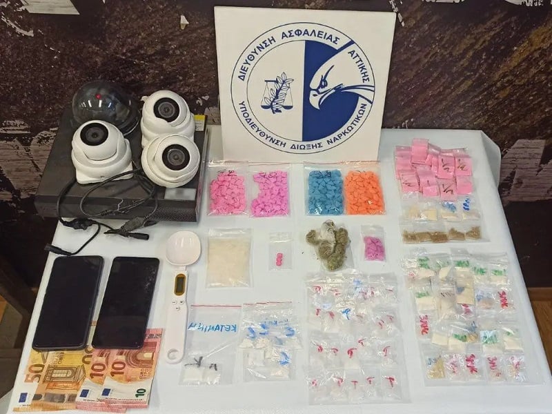 Από έρευνα στο σπίτι του και στην κατοχή του, βρέθηκαν συνολικά και κατασχέθηκαν 5,5 γραμμ. κοκαΐνης, 51,1 γραμμ. κρυσταλλικής μεθαμφεταμίνης, 29,4 γραμμ. MDMA, 332 δισκία ECSTASY, 5 γραμμ. ακατέργαστης κάνναβης υδροπονικής καλλιέργειας (SKUNK), 37,9 γραμμ. μεφεδρόνης, 2 γραμμ. κεταμίνης, ηλεκτρονικής ζυγαριά ακριβείας, αυτοκίνητο, το χρηματικό ποσό των 140 ευρώ, 4 κάμερες ασφαλείας, καταγραφικό και 2 κινητά τηλέφωνα.