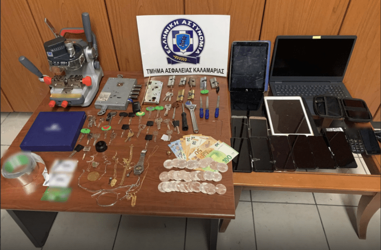 Παρουσία εκπροσώπου δικαστικής Αρχής, έγινε έρευνα στο διαμέρισμα που διέμενε ο 35χρονος άντρας, όπου βρέθηκαν και κατασχέθηκαν πλήθος κλειδιών θυρών διαφορετικών εταιρειών, μηχάνημα κοπής-διαμόρφωσης κλειδιών, αντικείμενα που διευκολύνουν τη διάρρηξη οικιών με αντικλείδι και κινητά τηλέφωνα που χρησιμοποιούσε στο πλαίσιο της εγκληματικής του δράσης.