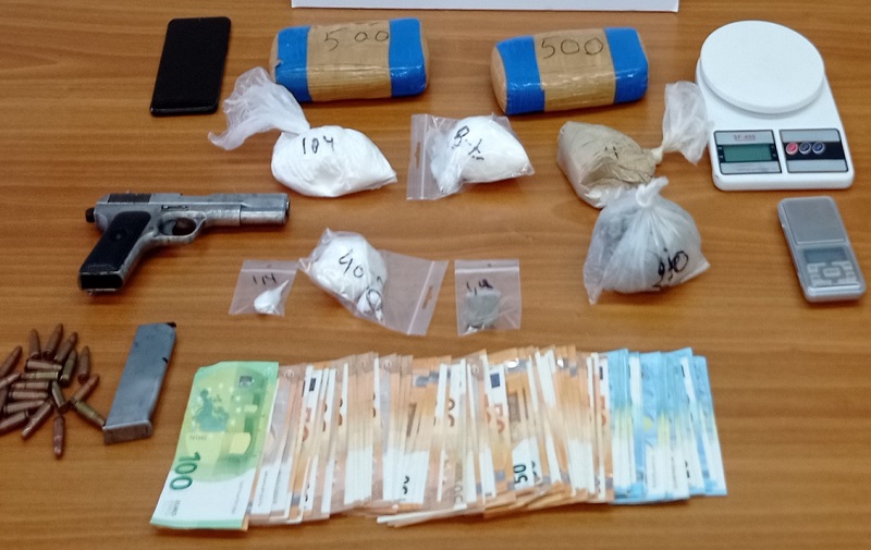 Σύμφωνα με την ΕΛ.ΑΣ., συνολικά βρέθηκαν και κατασχέθηκαν 1.132 γραμμάρια ηρωίνης, 223 γραμ. κοκαΐνης, 1,4 γραμ. κάνναβης, ένα πιστόλι, 19 φυσίγγια, 2 ηλεκτρονικές ζυγαριές και το χρηματικό ποσό των 3.710 ευρώ.