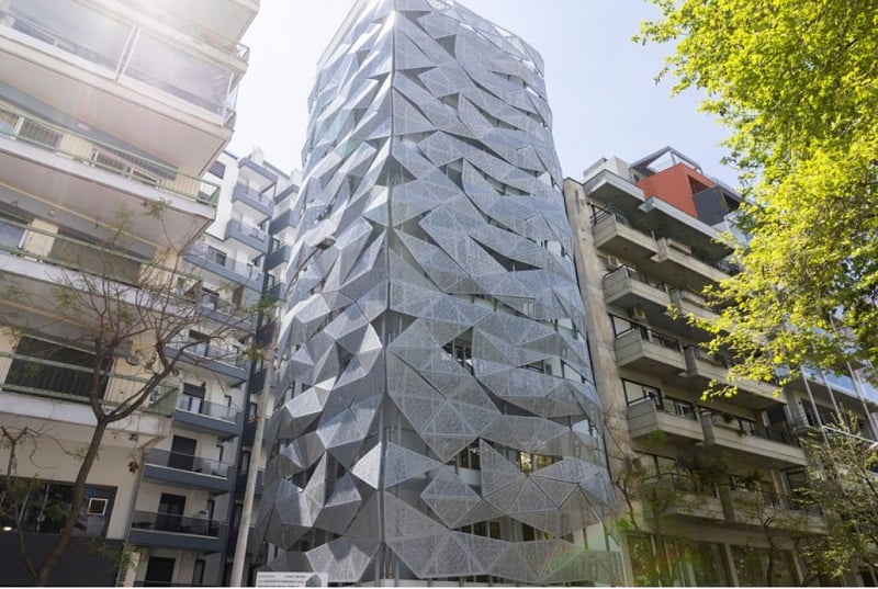 Η ιδιαιτερότητά του είναι, ότι η πρόσοψή του θυμίζει κύματα, με τα σκίαστρα αλουμινίου να αλλάζουν χρώμα ανάλογα με τις διαθέσεις του καιρού, καθώς το κτίριο, όπως αναφέρουν οι μελετητές, έχει μία πράσινο-μπλε απόχρωση όταν πέφτουν επάνω του οι αχτίδες του ήλιου και μία καφετί απόχρωση όταν τα σύννεφα καλύπτουν την πόλη της Θεσσαλονίκης. Το κτίριο «σηκώθηκε» σε ιδιόκτητο οικόπεδο μικρής έκτασης, σε παραδιπλανό δρόμο από το δημαρχιακό μέγαρο της Θεσσαλονίκης και για να γίνει η πλήρης αξιοποίηση των μόλις 181 τ.μ. αναπτύχθηκε σε ύψος. Στα αξιοσημείωτα είναι ο «πράσινος» χαρακτήρας του, καθώς στον ελεύθερο χώρο του δώματος θα τοποθετηθούν φωτοβολταϊκά πάνελ, που θα εξυπηρετούν ενεργειακά το κτίριο.