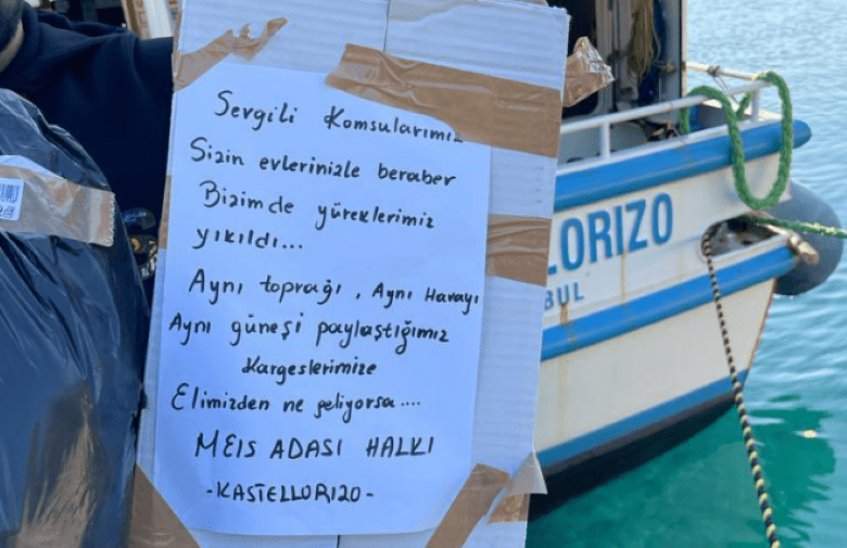 Το Γραφείο του Περιφερειακού Διοικητή του Καστελόριζου μοιράστηκε στον λογαριασμό του στα μέσα κοινωνικής δικτύωσης τις φωτογραφίες των δεμάτων αλλά και το σημείωμα στα κουτιά που έγραφε: «Αγαπητέ γείτονα. Οι καρδιές μας καταστράφηκαν μαζί με τα σπίτια σου. Ό,τι μπορούμε κάνουμε για τα αδέρφια μας, με τα οποία μοιραζόμαστε την ίδια γη, τον ίδιο αέρα και τον ίδιο ήλιο. Οι άνθρωποι του Καστελόριζου».