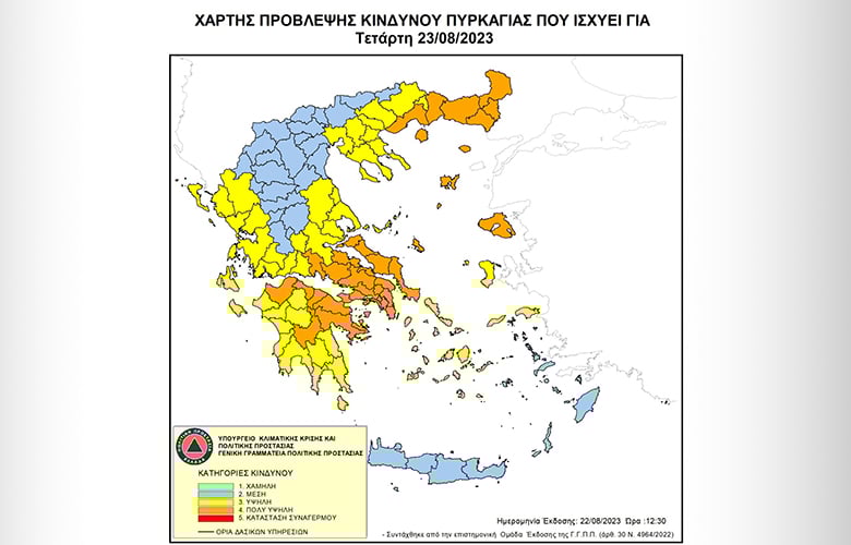 Πολύ υψηλός κίνδυνος πυρκαγιάς (κατηγορία κινδύνου 4) προβλέπεται αύριο για έξι περιφέρειες της χώρας, σύμφωνα με τον Χάρτη Πρόβλεψης Κινδύνου Πυρκαγιάς που εκδίδει η γενική γραμματεία Πολιτικής Προστασίας του υπουργείου Κλιματικής Κρίσης και Πολιτικής Προστασίας (civilprotection.gov.gr).